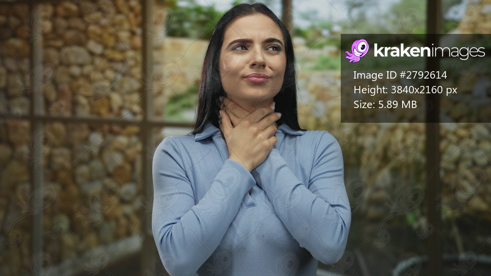Woman indoors suffering throat pain holds neck appearing uncomfortable against stone wall in bright living room.