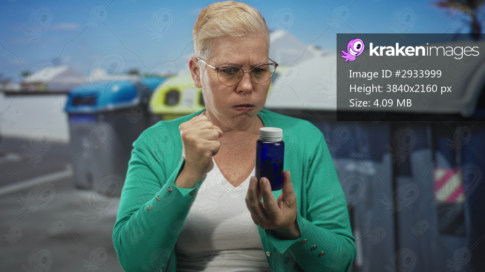 Woman inspecting blue pill bottle with hand near face by recycling containers on street; concern medication safety.