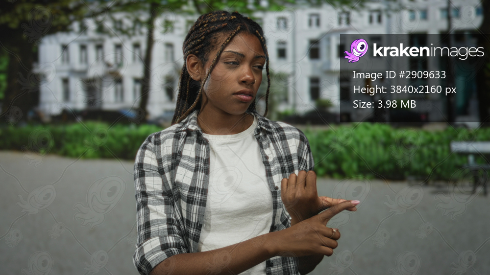 Woman inspecting fingernail while pointing with other hand on a city street; skepticism doubt hesitation.