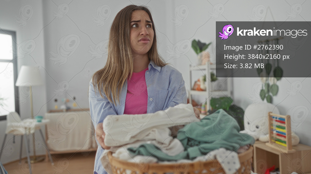 Woman inspecting laundry indoors, holding clothes in bright room with toys and plants, expressing surprise while sorting laundry in a home setting.