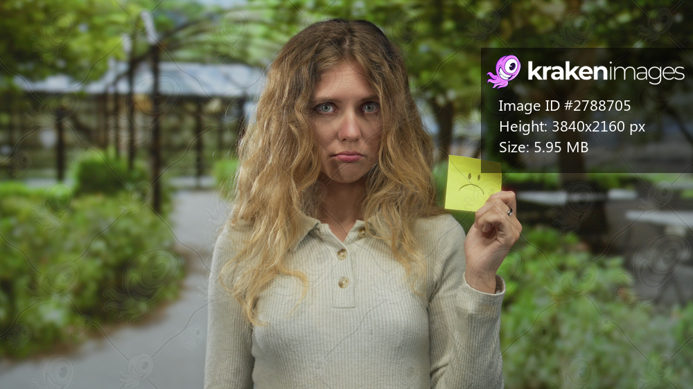 Woman inspects note before holding it in park where her blonde young sad expression contrasts with the yellow outdoor backdrop and the sticky paper texture. - Kraken Images