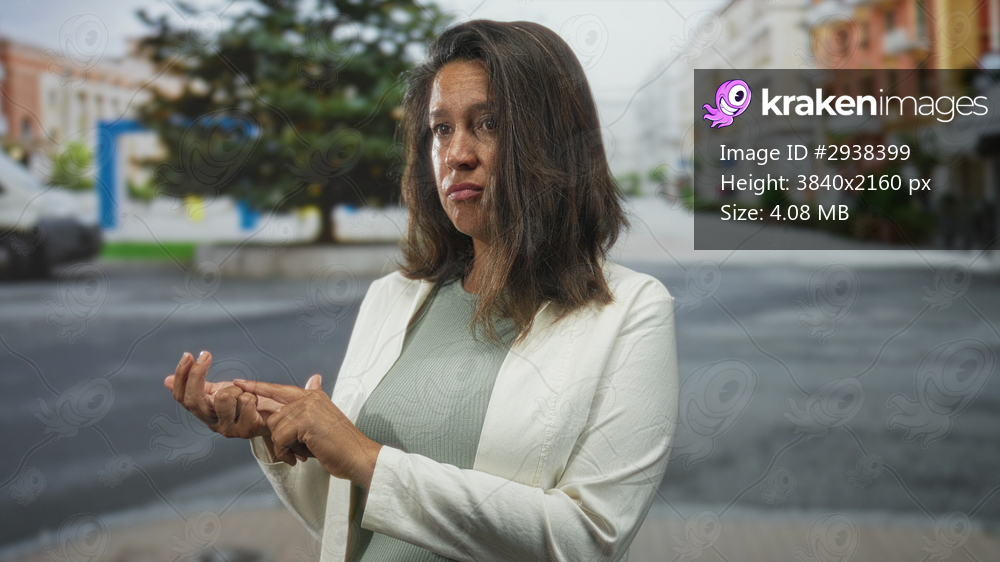 Woman inspects and rubs fingertip on her left hand on an empty city street near a tree planter, wearing white blazer and green top; concern contemplation. - Kraken Images