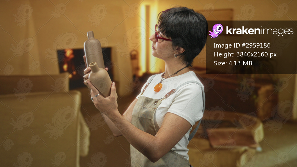 Woman inspects two ceramic bottles, holds them carefully with hands near chest while examining form in a pottery studio; quiet contemplation.