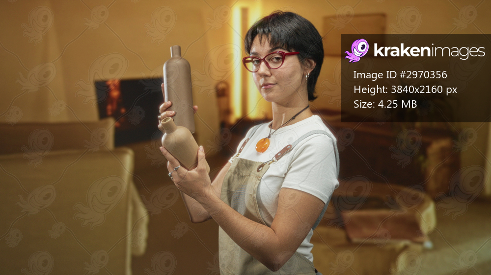 Woman inspects two ceramic bottles, holds them carefully with hands near chest while examining form in a pottery studio; quiet contemplation.
