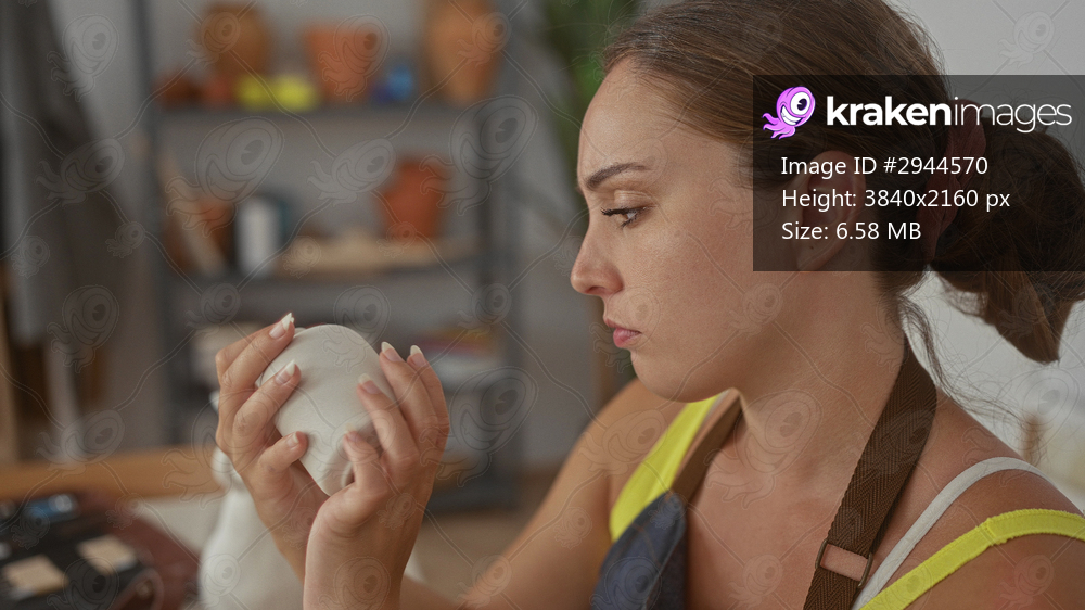 Woman inspects white ceramic vase in studio holding it near face with careful inspection; concentration craft.