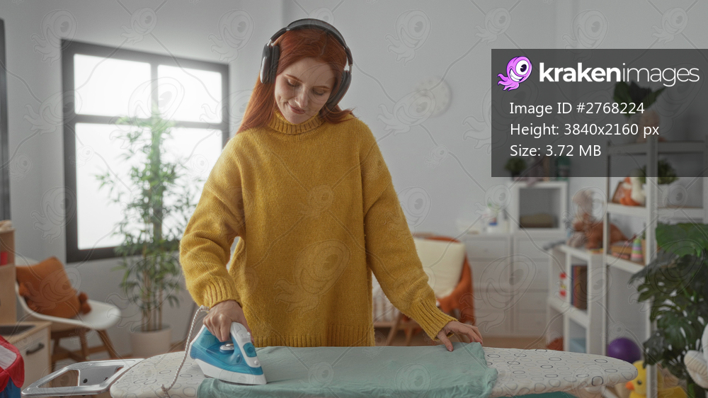 Woman ironing in a cozy laundry room wearing headphones and a yellow sweater, showcasing modern home lifestyle and relaxation.