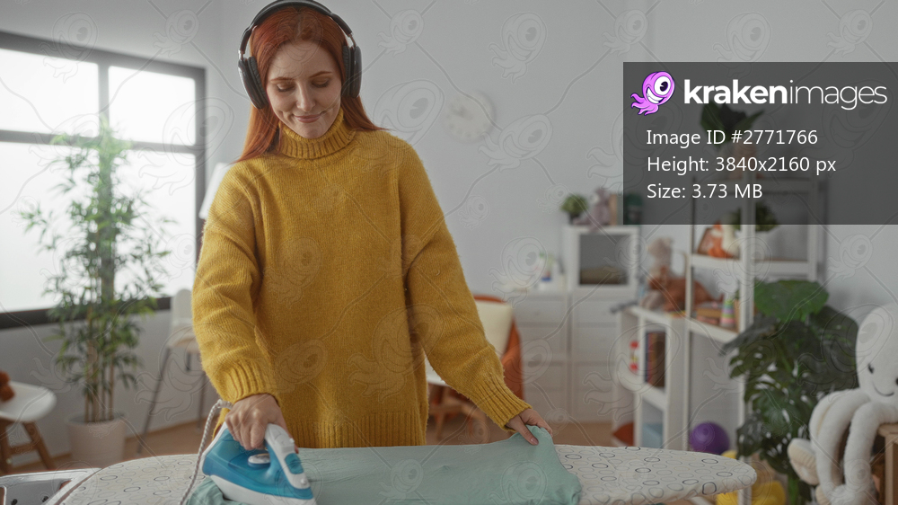 Woman ironing in a cozy laundry room wearing headphones and a yellow sweater, showcasing modern home lifestyle and relaxation.