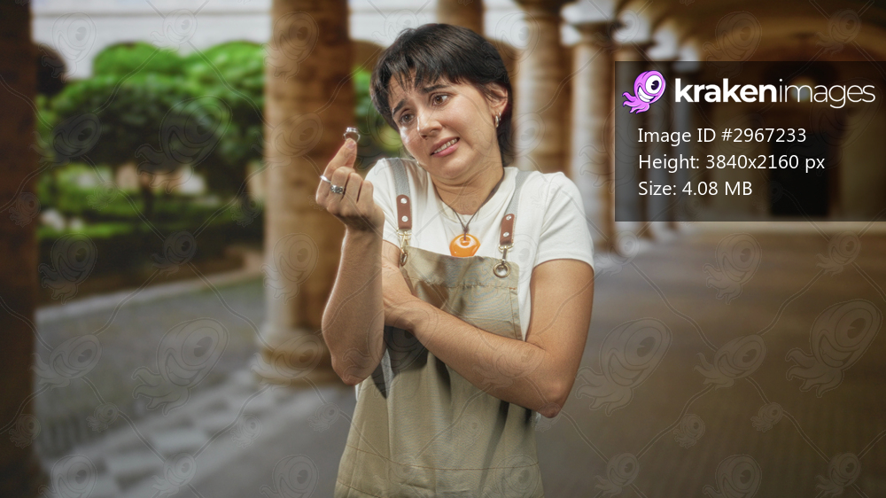 Woman jeweler holding a ring between fingers, showing bare hand and a hesitant presenting gesture in a colonnade building; uncertainty.