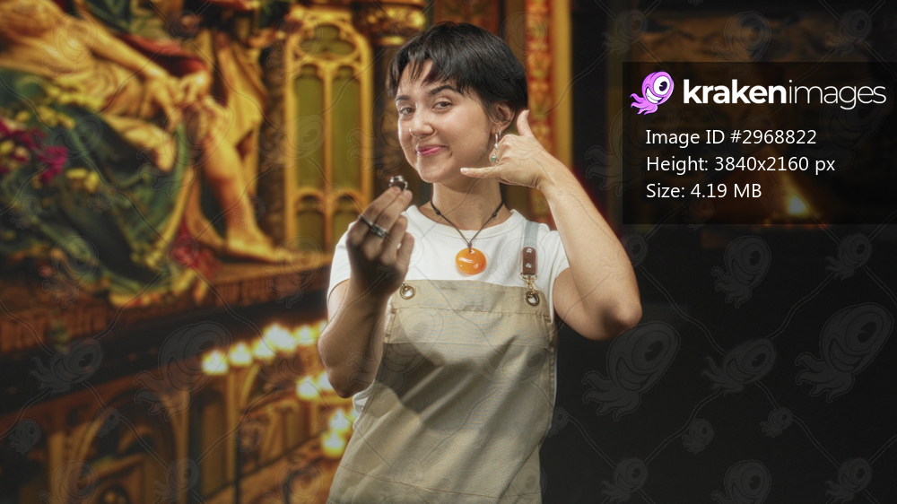 Woman jeweler holding a ring, hand to ear call gesture in studio with ornate gold altar, candlelight and sculptural backdrop; playful charm.
