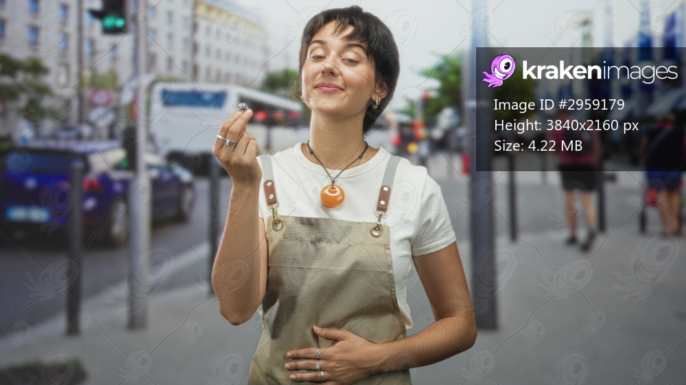 Woman jeweler holding a small ring between fingers on a city street, wearing apron and orange pendant while smiling; craft pride.