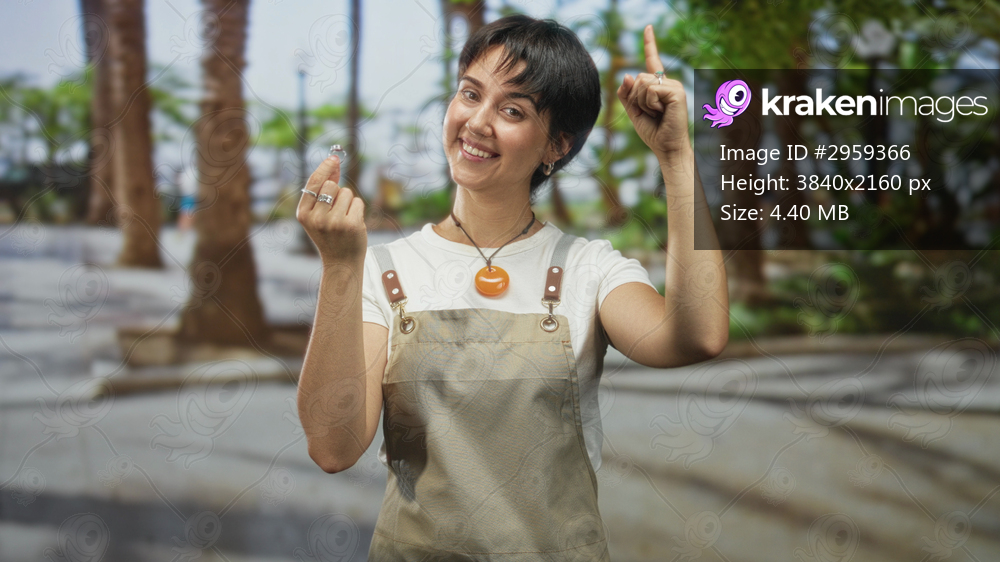 Woman jeweler holding ring between fingers and pointing index finger on street promenade; joy craft skill.