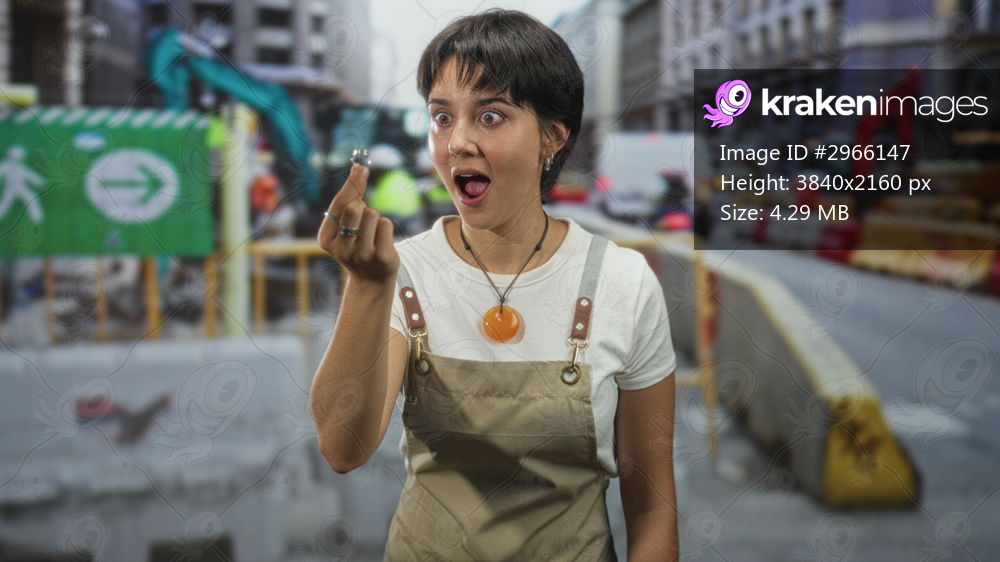 Woman jeweler holds small ring between thumb and forefinger on a busy city street construction zone, wearing an apron and pendant necklace; surprise discovery. - Kraken Images