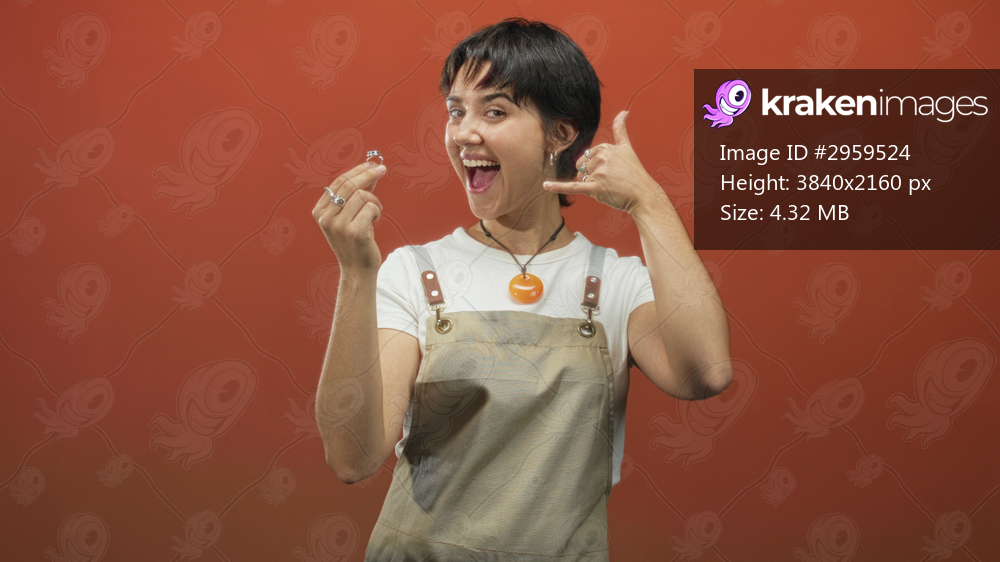 Woman jeweler wearing apron holding ring with left hand and making call gesture with right hand while smiling in studio; playful confidence.