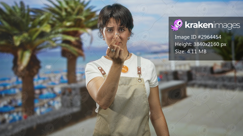 Woman jeweler wearing apron and short hair holding a ring in hand, inspecting it on a seaside street with palms and umbrellas; uncertainty appraisal.