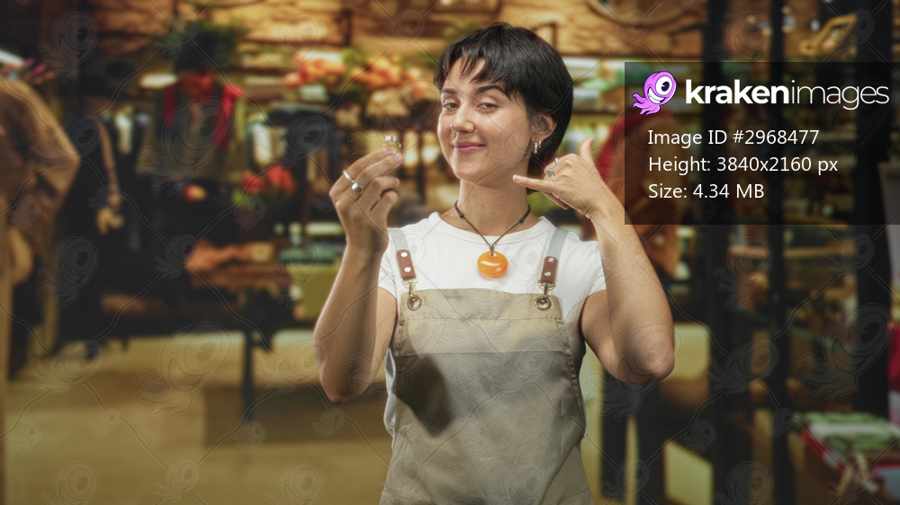 Woman jeweler wearing apron with short hair holding ring and making call me gesture in studio; craft pride skill.