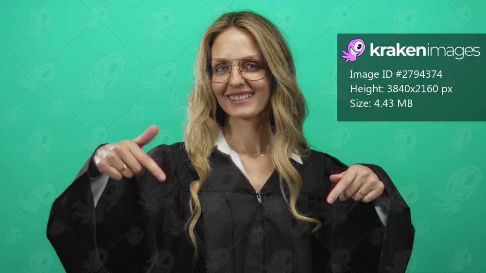 Woman judge with blonde hair smiles in uniform pointing down on isolated green background wall conveying legal authority and confidence.