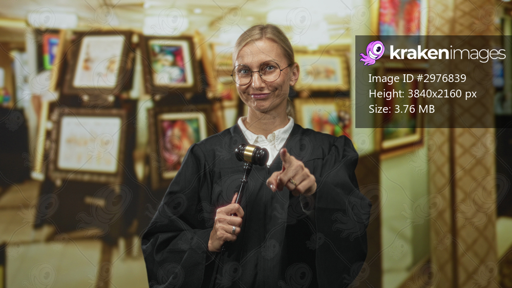 Woman judge, blonde, in black robe holds gavel and points with index finger amid framed paintings in a building; authority decision.