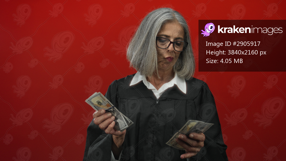 Woman judge counting cash with hands while inspecting dollar bills in a red studio set wearing a judicial robe; financial concern.