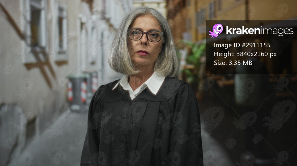 Woman judge with grey hair wearing glasses and black robe standing and looking at camera on a narrow cobbled street by a cafe and building facades; authority. - Kraken Images
