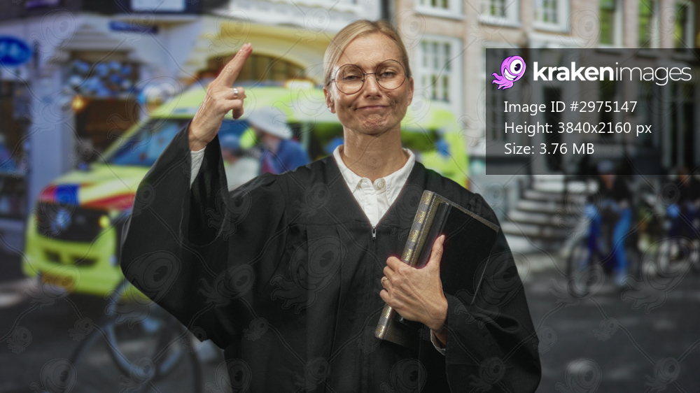 Woman judge holding a large law book with hand raised on a busy street beside a yellow ambulance and passing cyclists; confidence resolve.