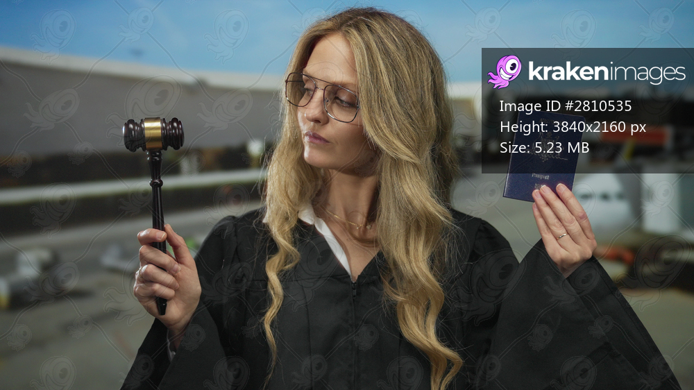 Woman judge holding australian passport and gavel standing in airport terminal, suggesting judicial authority and international travel.