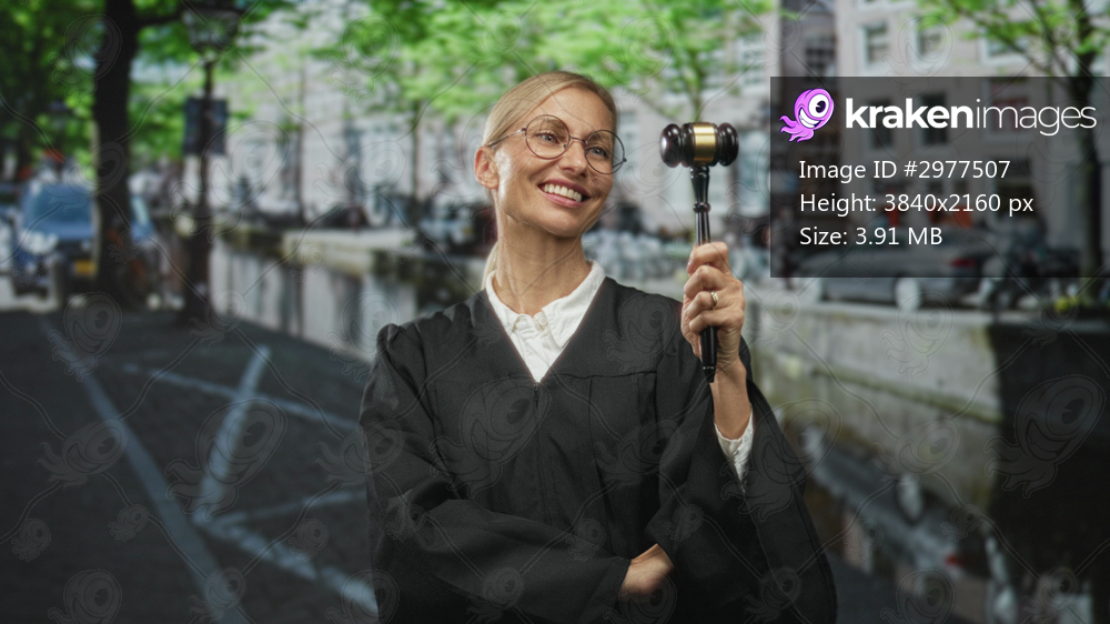 Woman judge holding gavel aloft and smiling while standing on a street canal; justice authority confidence.