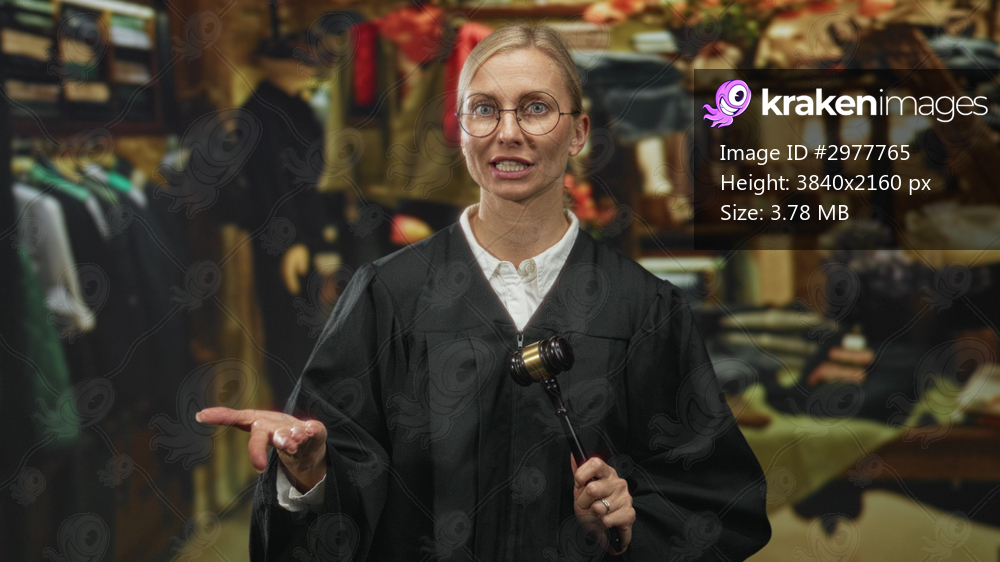 Woman judge holding gavel points finger in studio boutique setting with visible clothing racks and shelves; authority.