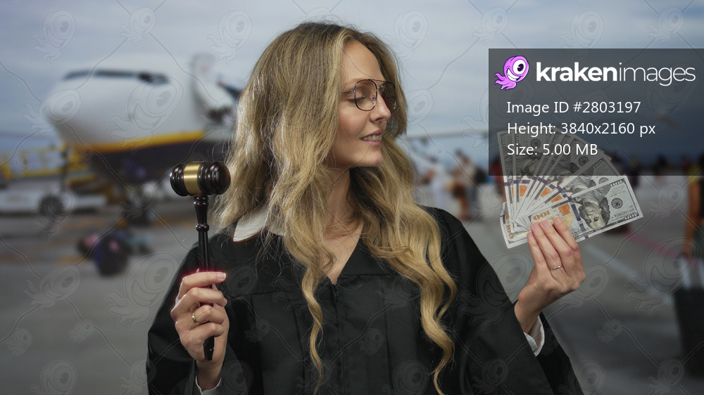 Woman judge holding gavel and us dollars at airport terminal outdoors with airplane in background symbolizing justice and wealth travel concept.