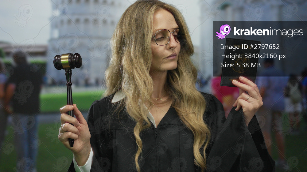 Woman judge holding mexican passport and gavel in front of pisa tower, embodying legal authority and international travel outdoors in italy.