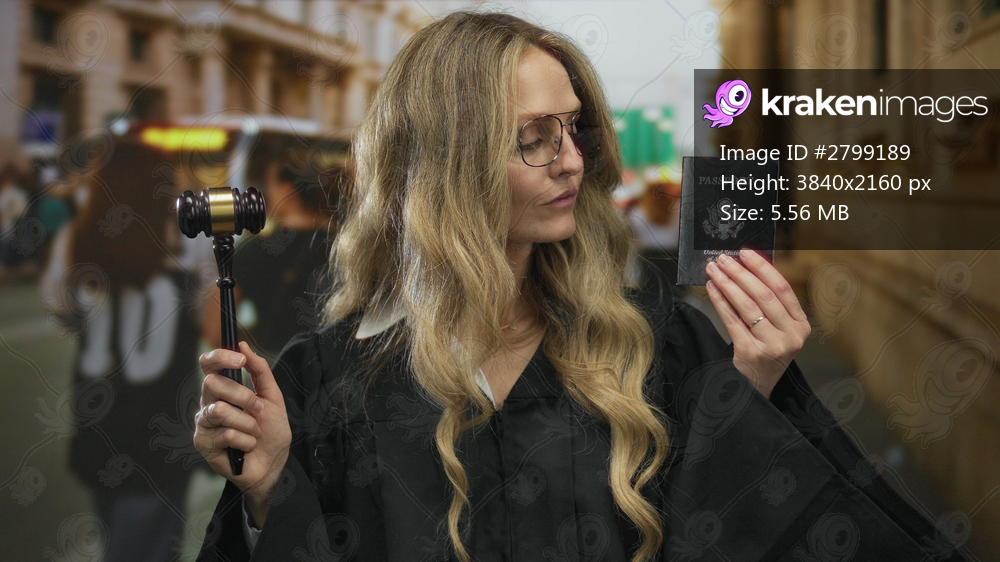 Woman judge holding united states passport in outdoor street setting with gavel in hand, illustrating legal and identification themes under bright daylight. - Kraken Images