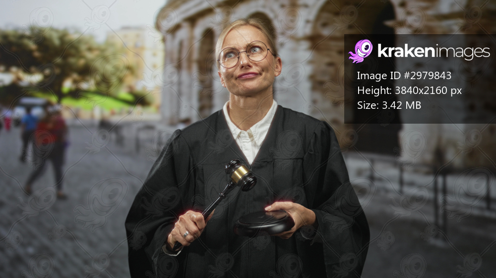 Woman judge holds gavel and soundblock outside stone building with questioning thoughtful expression; authority reflection.