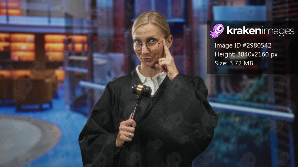 Woman judge holds gavel and touches temple with index finger in studio, eyeglasses visible and robe worn; authority confidence.