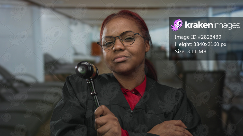Woman judge holds polished wooden gavel near cheek in spacious building with serious gaze; authority.