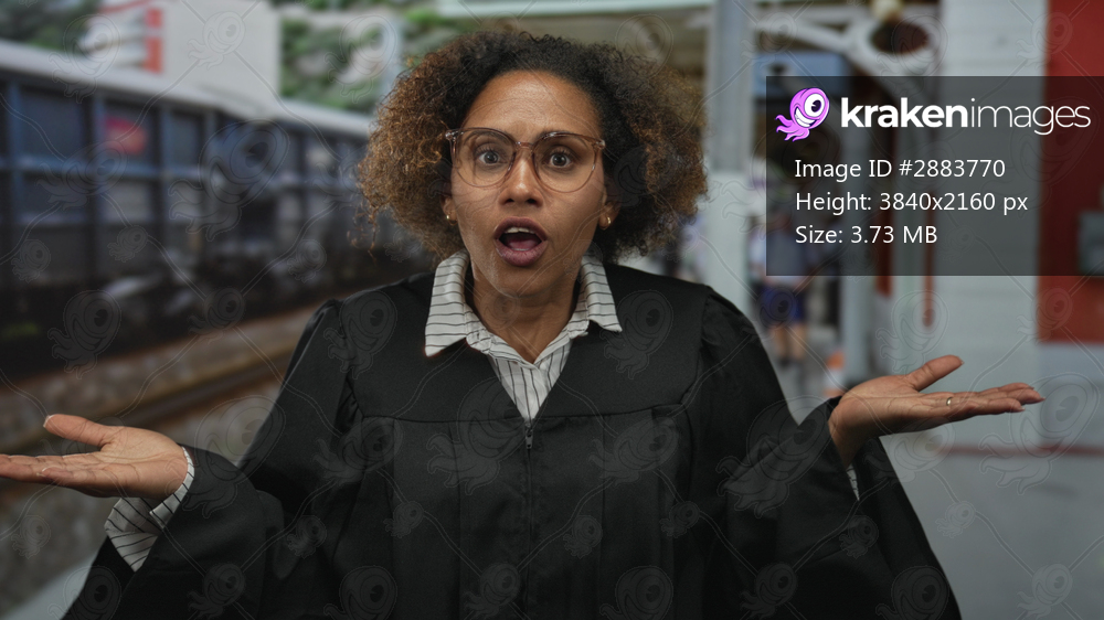 Woman judge in black robe with face forward shrugging palms up on a busy train station platform; surprise.