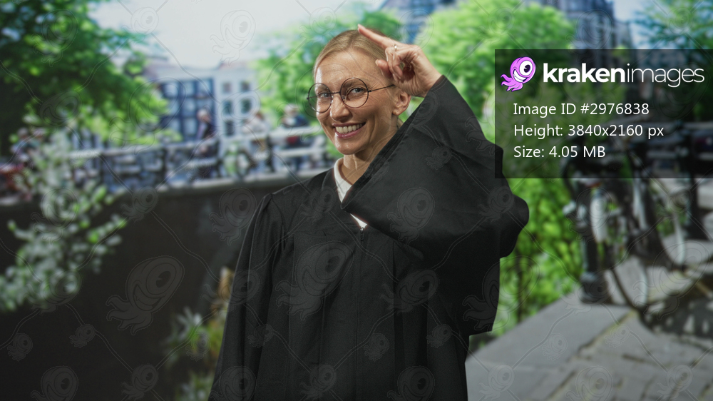 Woman judge in black robe with finger to temple and visible face on a street canal; thoughtful confidence.