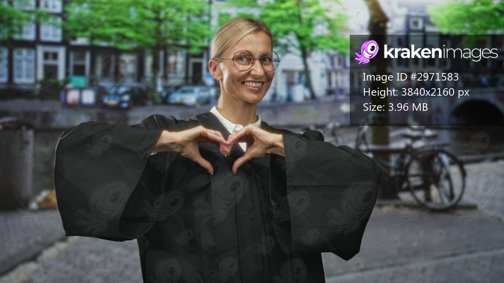 Woman judge in black robe forms a heart with hands on a cobbled street beside a canal and parked bicycle; compassion love.