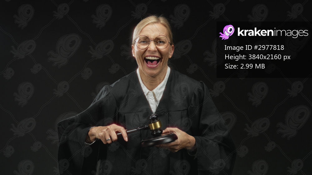 Woman judge in black robe and glasses holds wooden gavel and strikes sounding block with both hands, laughing, in studio; authority joy.