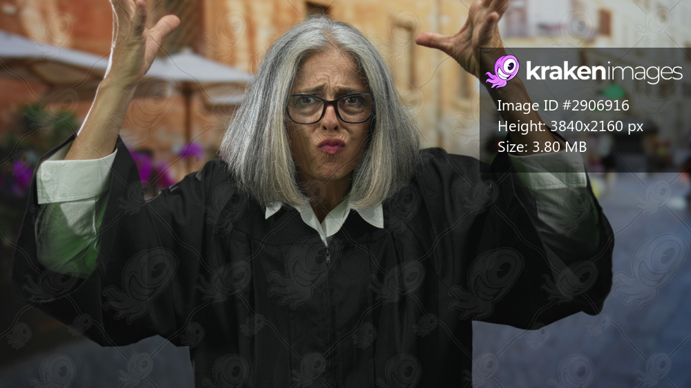 Woman judge in black robe, grey hair and glasses shrugging with hands raised at outdoor restaurant terrace among blurred tables; legal exasperation.
