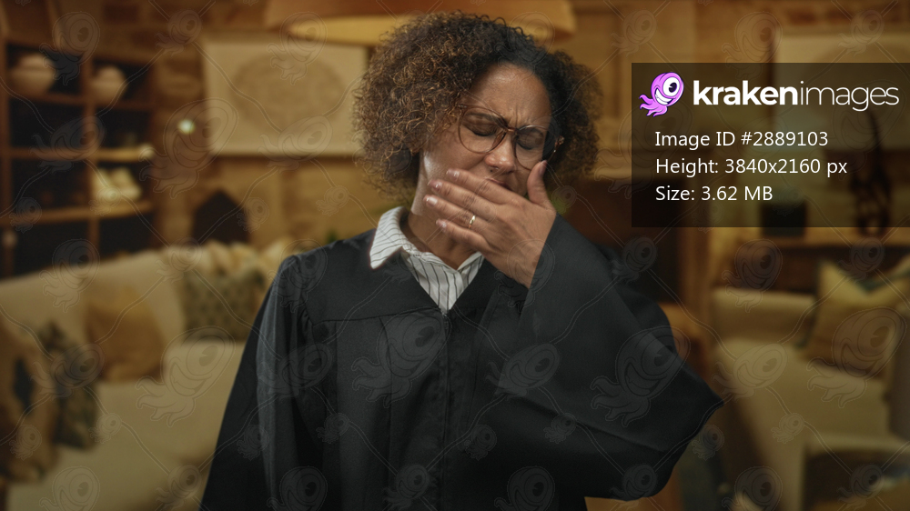 Woman judge in black robe grimacing with eyes closed inside a living room building; emotional distress.