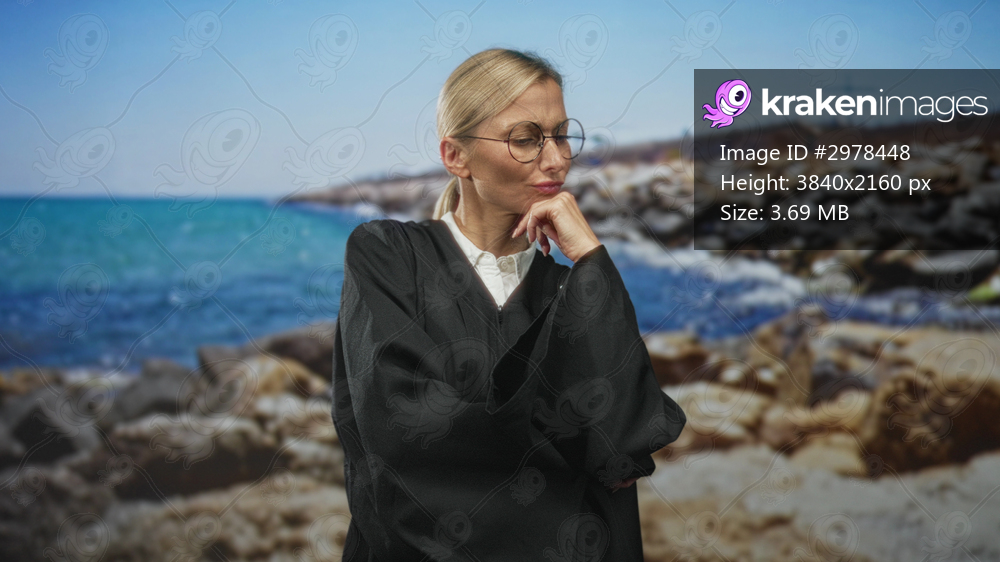 Woman judge in black robe with hand on chin and slight head tilt in studio with projected beach backdrop; contemplation.