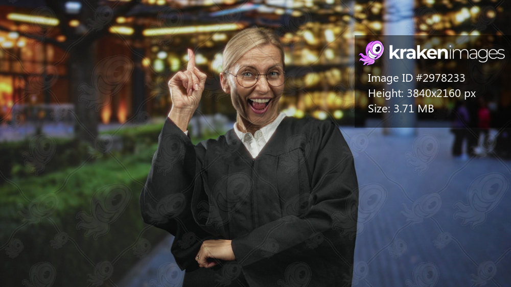 Woman judge in black robe with hand on chin thoughtful pose outside illuminated building at night; thoughtful inspiration.