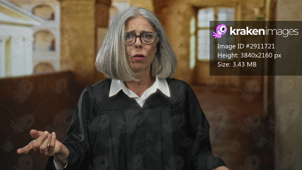 Woman judge in black robe with hands raised gesturing in an old building corridor; justice plea frustration.