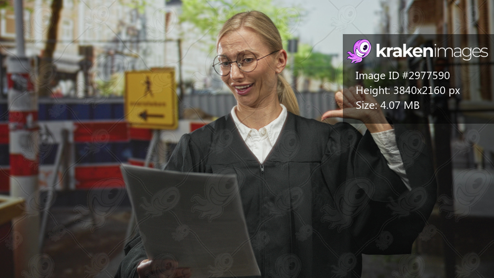 Woman judge in black robe holds documents and points thumb to self on a city street construction; confidence authority judgment.