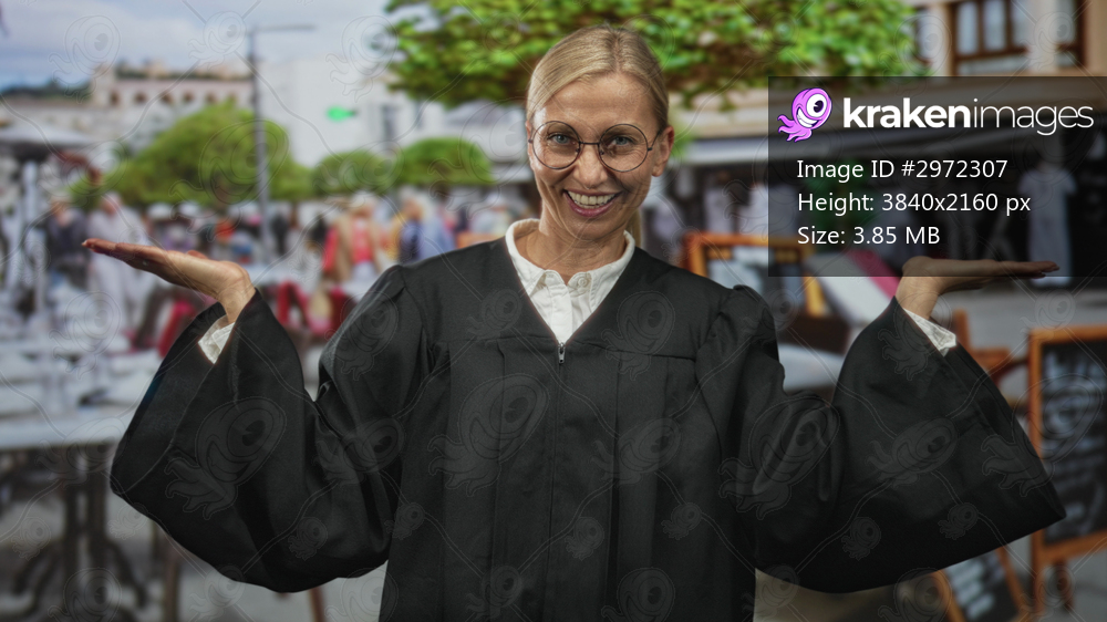 Woman judge in black robe holds hands palms up amid outdoor cafe tables and pedestrians on a busy urban street; warm confidence.