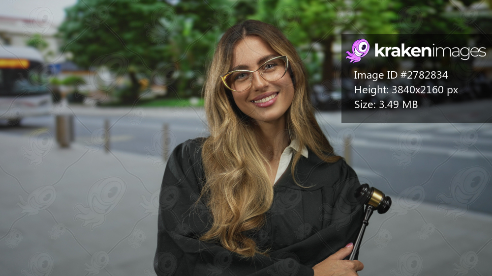 Woman judge in black robe holds wooden gavel at a busy bus station platform; authority, confidence, fairness.