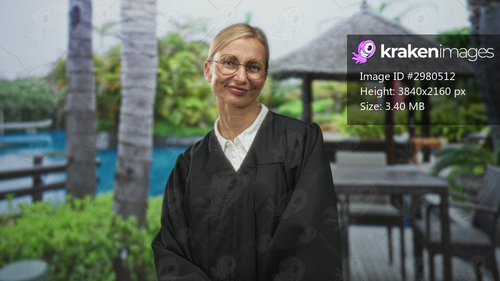 Woman judge in black robe raises fists and smiles showing face by poolside pavilion building; confidence celebration.