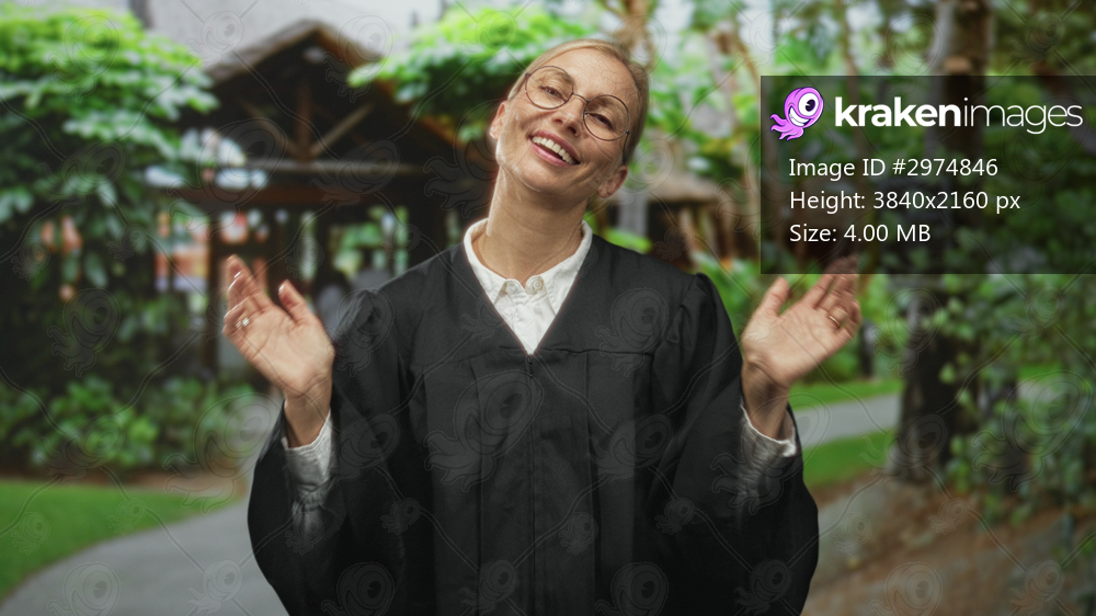 Woman judge in black robe raises hands and tilts head back at building entrance with glasses, palms open in a leafy courtyard; serenity calm gratitude. - Kraken Images