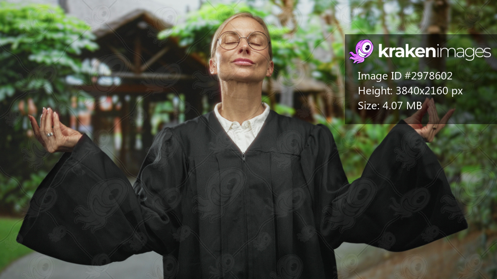 Woman judge in black robe raises hands and tilts head back at building entrance with glasses, palms open in a leafy courtyard; serenity calm gratitude. - Kraken Images