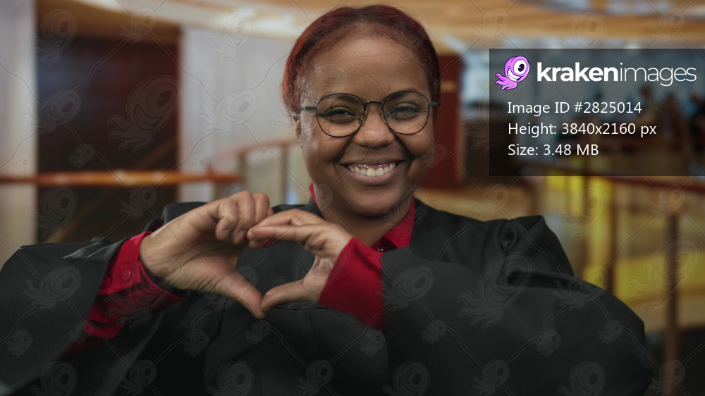 Woman judge in black robe shapes a heart with hands in hotel building lobby for supportive gesture; love.
