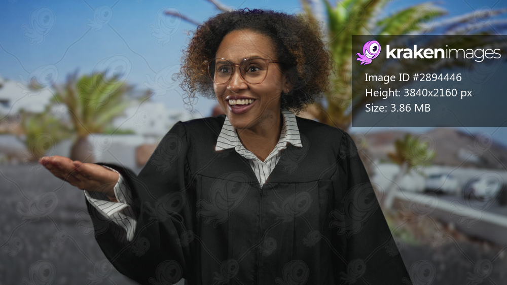Woman judge in black robe smiling and raising hands in a shrug gesture on street with palm trees and cars; joy celebration.